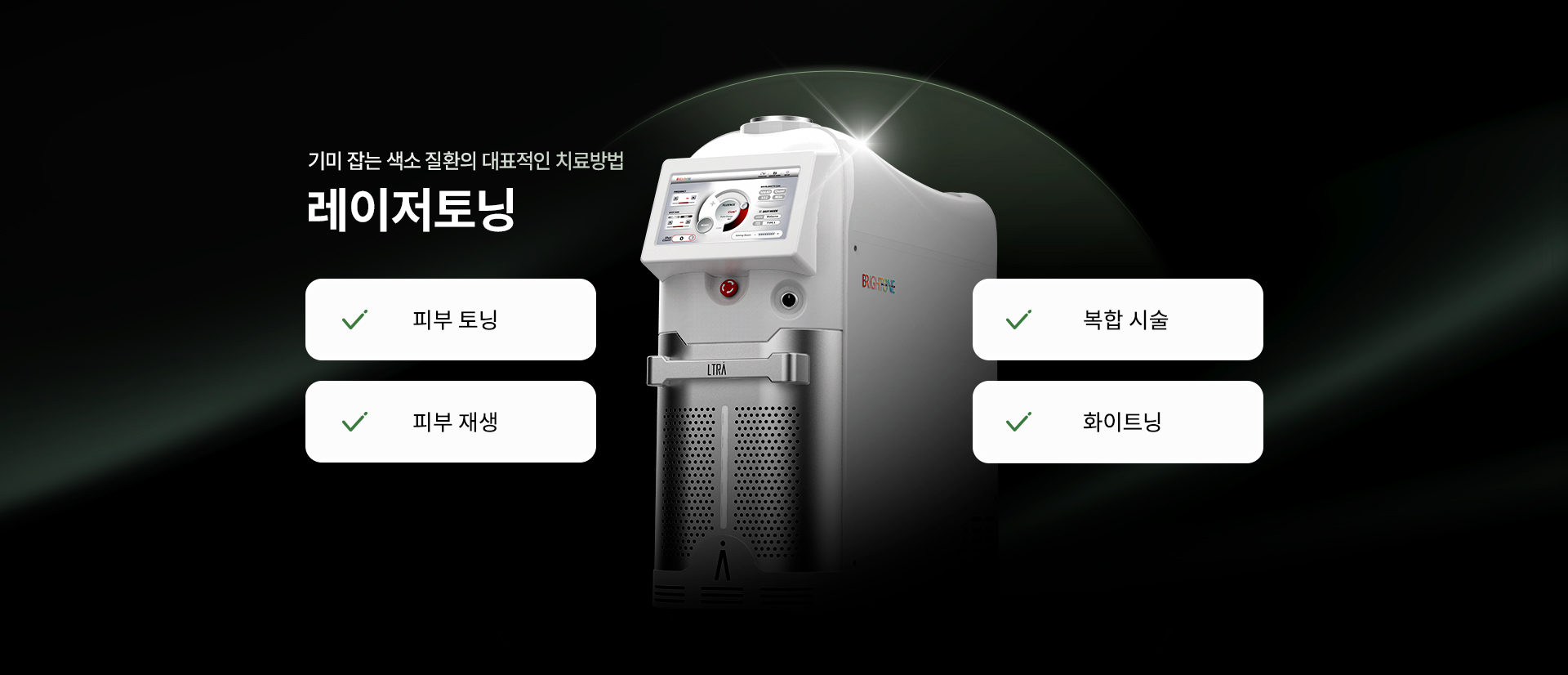 깊은 파장의 레이저 빛이 피부 속 깊은 곳까지 도달하여 멜라닌 색소에 선택적으로 작용해 피부 손상없이 빠르게 파괴하며 잘게 부서진 색소는 인체에서 배출됩니다.