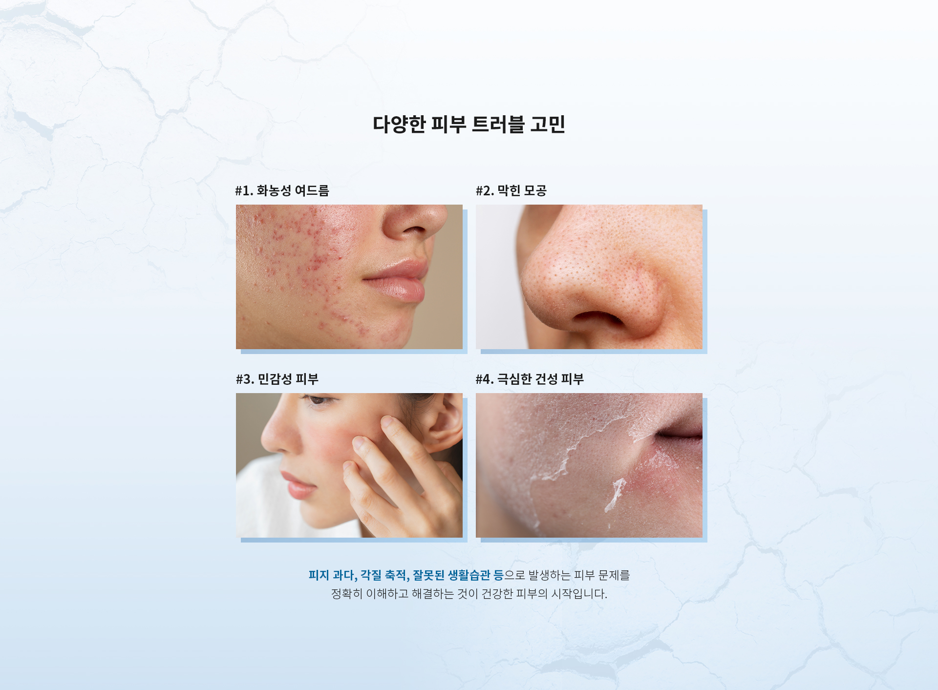 피지 과다, 각질 축적, 잘못된 생활습관 등으로 발생하는 피부 문제를 정확히 이해하고 해결하는 것이 건강한 피부의 시작입니다.
