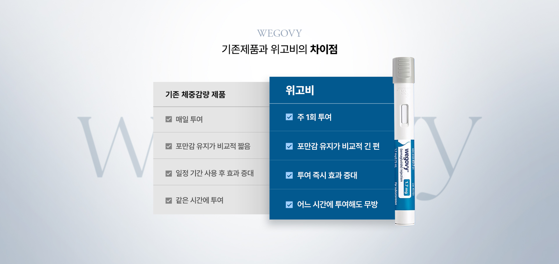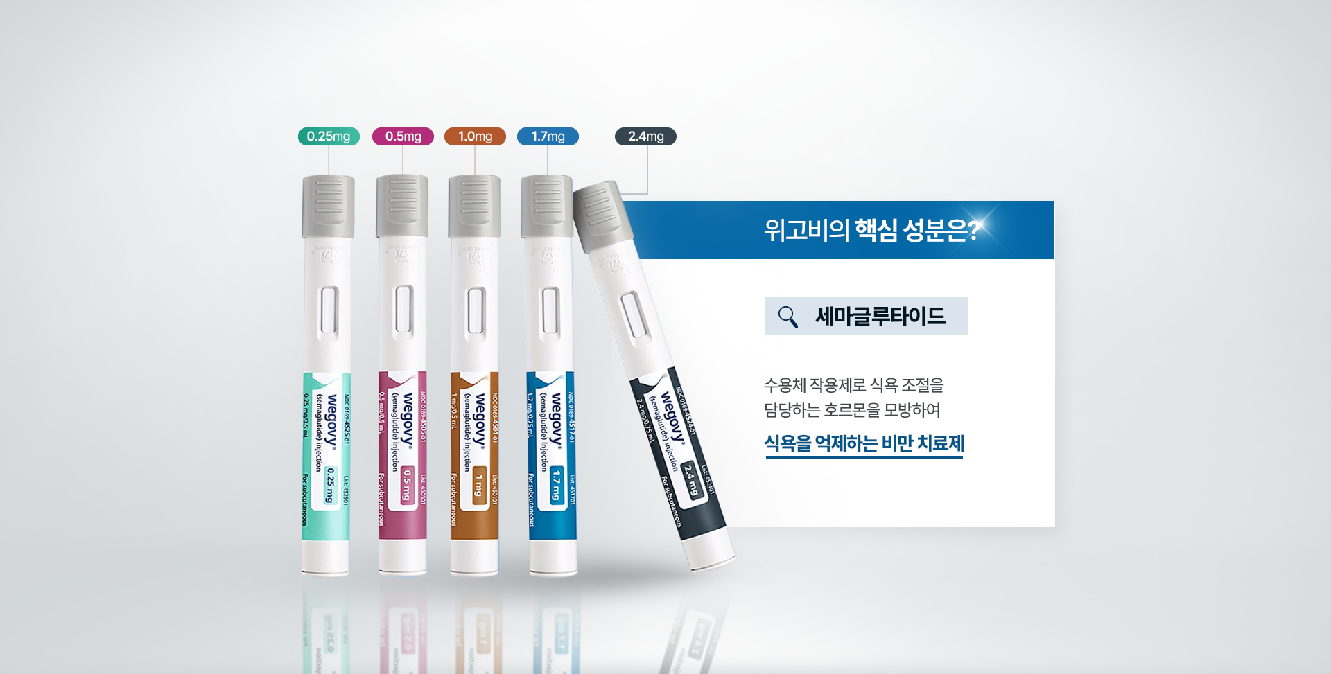 위고비는 체중 감소를 목적으로 만들어진 주 1회 주사 치료제입니다. 식욕을 억제하는 'GLP-1' 호르몬을 활성화하여 체중 감량을 유도합니다.